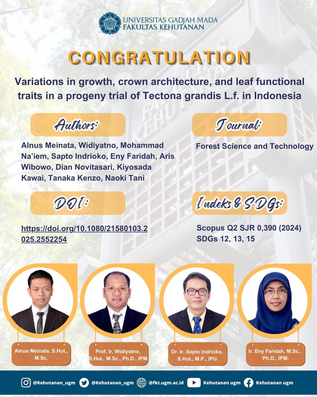 Teak (Tectona grandis) is a valuable tropical timber species, but knowledge about its environmental adaptability for tree breeding is limited. Progeny trial is crucial for improving breeding materials as progeny performance and resilience to environmental stresses can be assessed for future breeding effort. In this study, we examined the variations in growth, crown architecture and leaf traits in a progeny trial in Indonesia. We retained the best components to explain the relationships among 14 traits and analyzed their genotypic correlations. Our results indicate that family differences contribute to the variation in leaf functional traits such as phosphorus content and SPAD value, which indicate chlorophyll content. Further, we identified three major trait axes that explained most of the trait variations by principal component analysis. The first and second axes represented the leaf economics spectrum, and variations related to tree size, respectively, while the third axis represented venation traits. Additionally, leaf chlorophyll content indicated by SPAD value was an effective tool for evaluating progeny performance because of its strong correlations with growth rate and leaf nutrient contents. These findings provide valuable insights for future progeny trial planning in breeding programs toward enhancing resilience and productivity in teak.