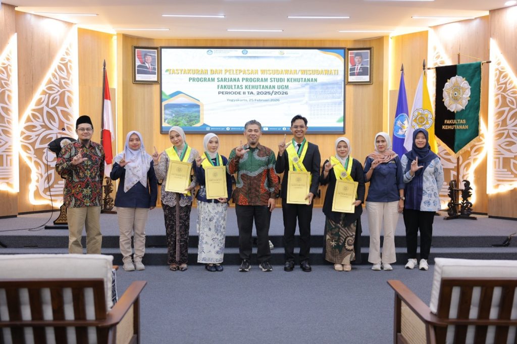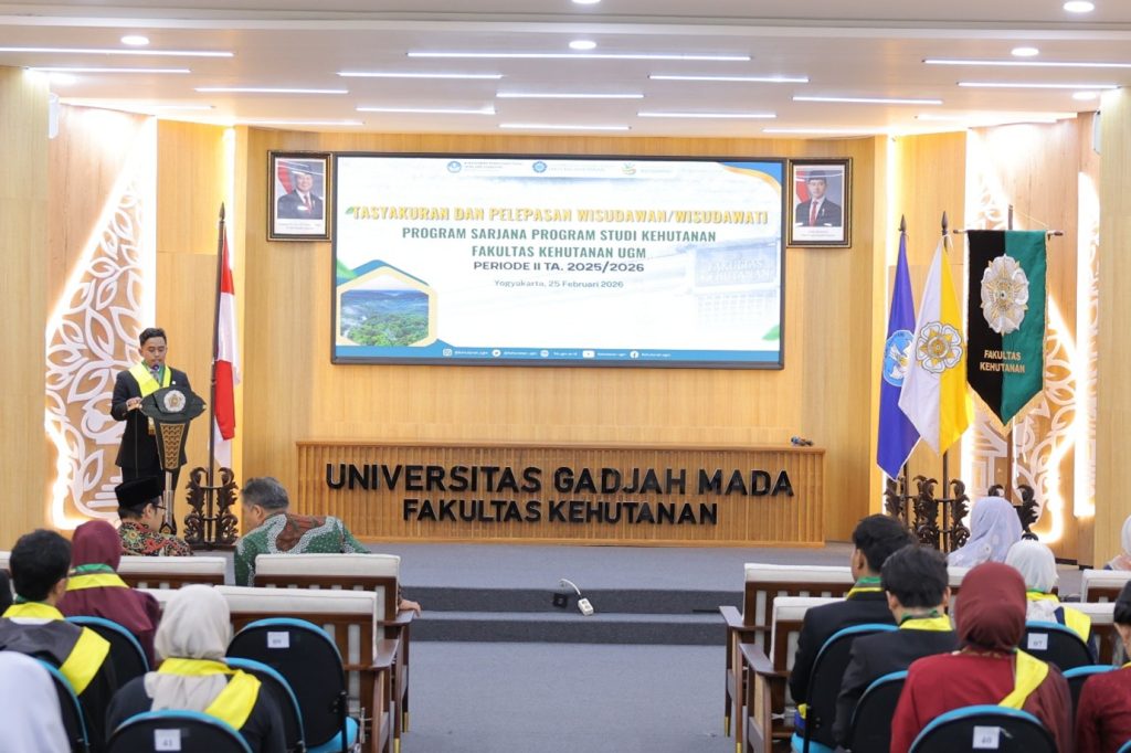 Yogyakarta – Fakultas Kehutanan Universitas Gadjah Mada kembali melepas lulusan Program Studi Sarjana Kehutanan pada Wisuda Periode II Tahun Akademik 2025/2026 yang digelar Rabu, 25 Februari 2026, mulai pukul 13.00 WIB. Prosesi yang berlangsung secara luring di Auditorium Gedung A tersebut diikuti oleh para wisudawan dan wisudawati bersama pendamping, dosen, serta tenaga kependidikan dalam suasana penuh rasa syukur dan kebanggaan.