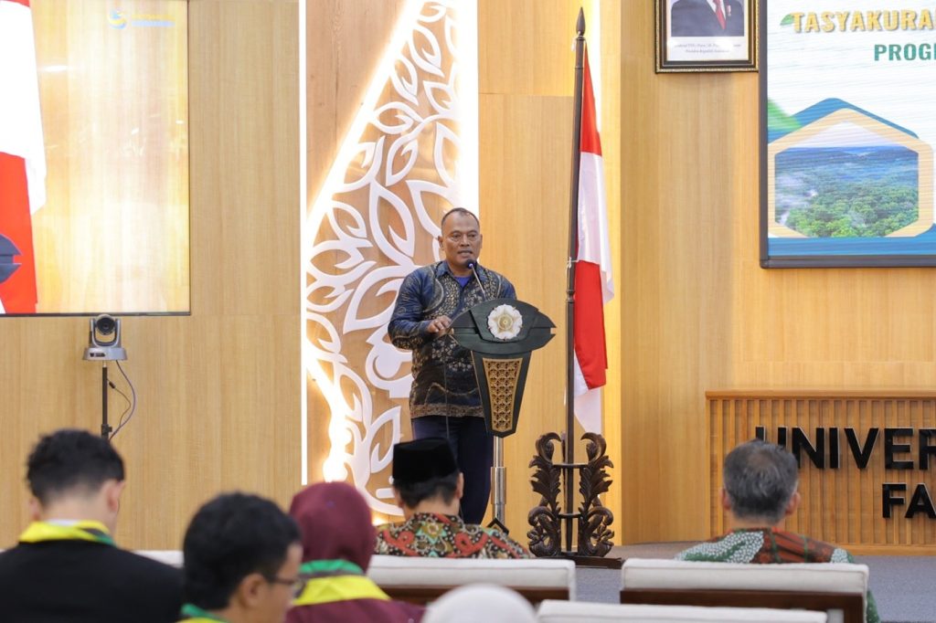 Sementara itu, Wakil Dekan Bidang Akademik dan Kemahasiswaan, Ir. Dwiko Budi Permadi, S.Hut., M.Sc., Ph.D., IPU. dalam pesannya menyoroti berbagai peristiwa bencana alam yang terjadi akhir-akhir ini di Sumatera. Ia menyampaikan bahwa kabar tersebut menjadi pengingat sekaligus tantangan nyata bagi para rimbawan baru. “Peristiwa bencana alam ini menjadi tantangan bagi kita untuk menerapkan bekal ilmu yang telah diperoleh selama perkuliahan,” ujarnya. Ia mengajak seluruh lulusan untuk terus berjuang dan berkontribusi nyata demi mewujudkan Indonesia yang lebih lestari dan berkelanjutan.