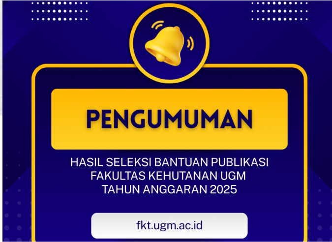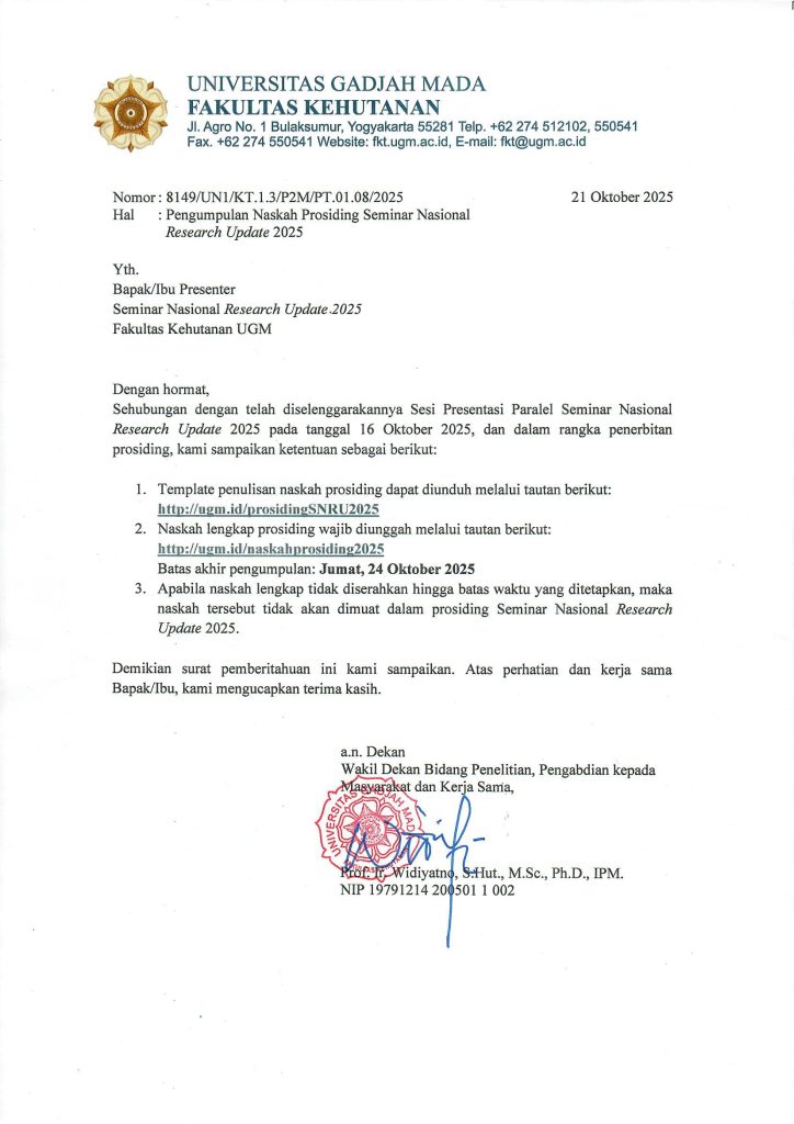 Diberitahukan kepada Bapak/Ibu Ketua Kegiatan Penelitian dan Pengabdian Tahun 2025 Fakultas Kehutanan UGM, sesuai dengan tata waktu Penelitian dan Pengabdian kepada Masyarakat tahun 2025 pada tanggal 30 Juni 2025 Bapak/Ibu ...