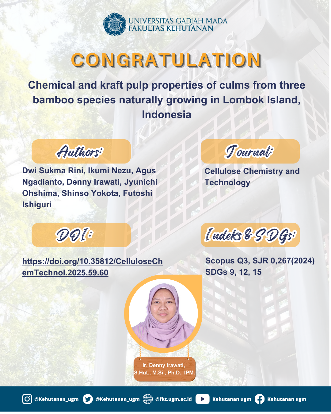 This study aimed to investigate morphology and proportion of wood cell due to effect of lateral growth rate and radial position in white jabon [Neolamarckia cadamba (Roxb.) Bosser]. A total of nine trees of 10-year-old were used and wood samples were collected from the trees grown in progeny trial plot in Central Java Province, Indonesia. The parameters observed were cell morphology and proportion, including fiber length, fiber diameter, fiber lumen diameter,