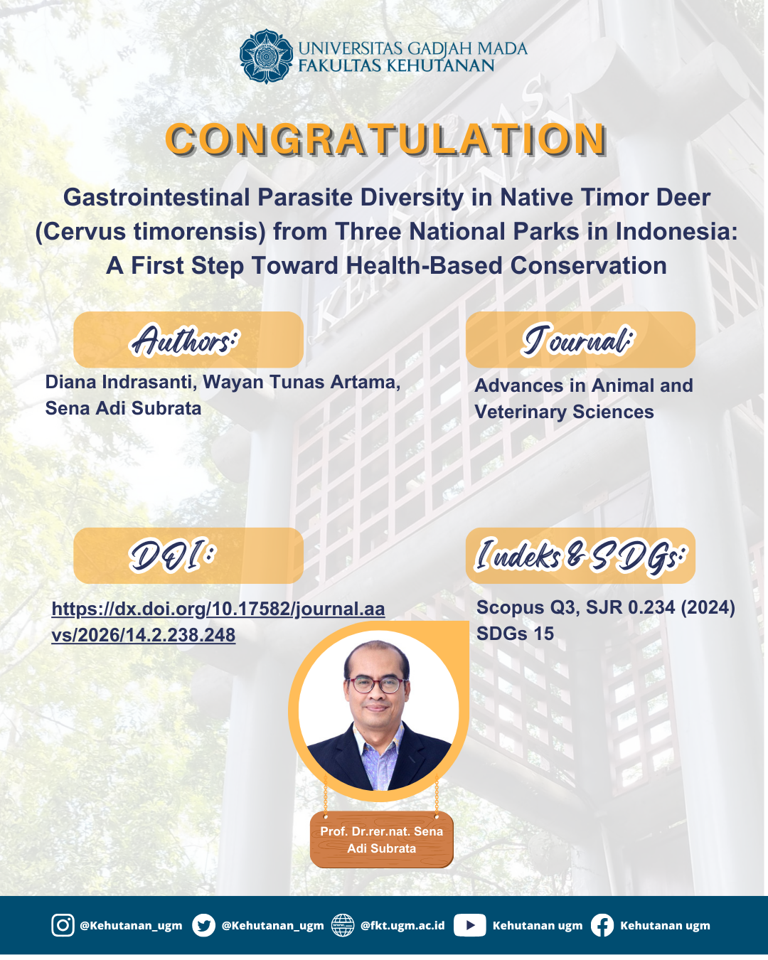 Parasitism is a disease that commonly occurs in ruminants, including wild native Timor deer (Rusa deer). Variation of parasite types in wild Timor deer in three national parks (NP) in Indonesia, namely Baluran NP, Alas Purwo NP, and West Bali NP, has never been done. This research aimed to detect the types, number, prevalence, and diversity of gastrointestinal parasites in wild Timor deer (Cervus timorensis) in the three national parks. The research used a