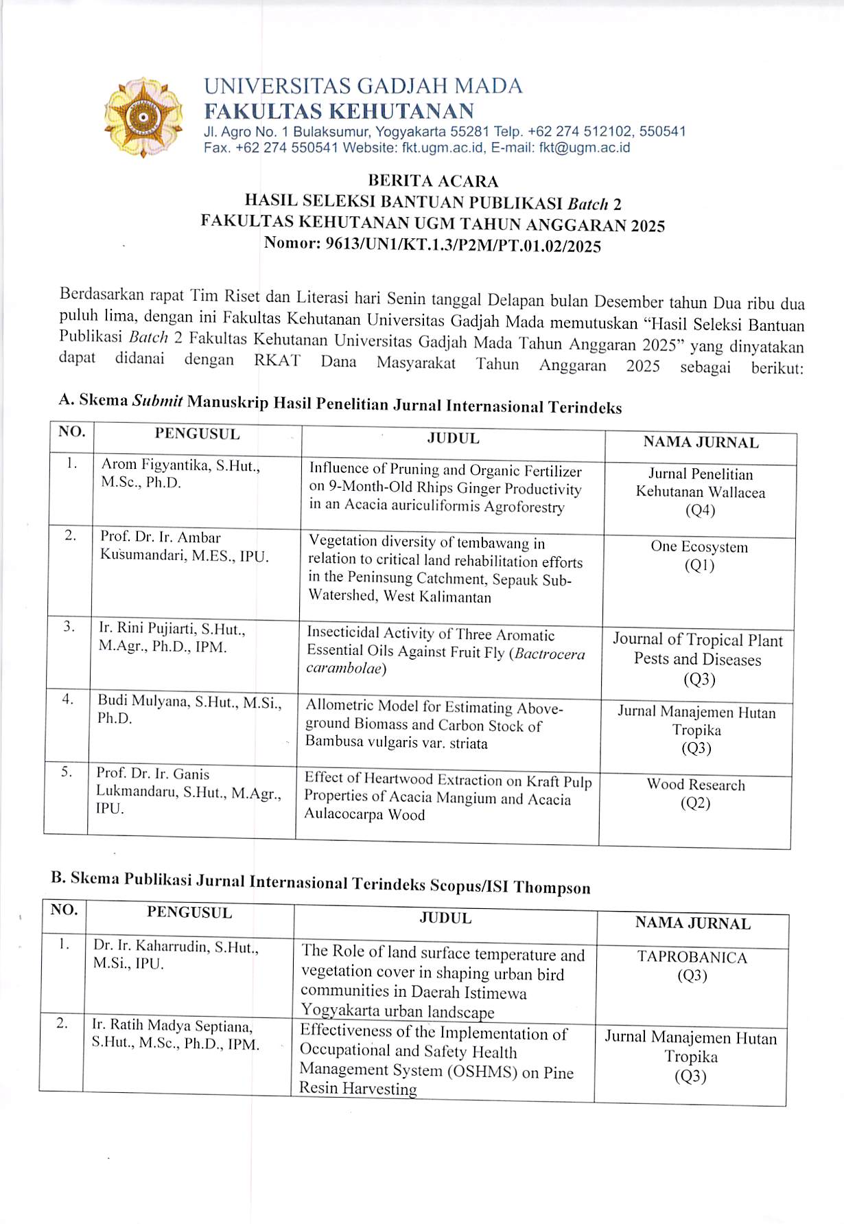 Berdasarkan hasil rapat Tim Riset dan Literasi hari Jum’at, 4 Oktober 2024 dengan ini Fakultas Kehutanan Universitas Gadjah Mada memutuskan Hasil Seleksi Bantuaj Publikasi Batch 1 Fakultas Kehutanan Universitas Gadjah Mada Tahun 2024 sebagai berikut: